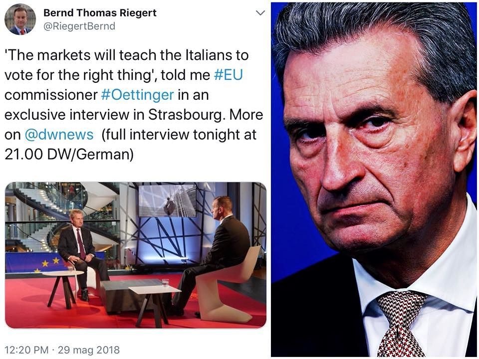 E’ bufera sul commissario Ue al Bilancio, il tedesco Guenther Oettinger. Il giornalista Bernd Riegert ha postato un tweet secondo cui Oettinger (da lui intervistato) avrebbe dichiarato che “i mercati insegneranno agli italiani a votare”. Immediate le proteste di Salvini e Pd che hanno condannato le dichiarazioni del commissario chiedendone le dimissioni. Dura la condanna anche da parte del presidente della commissione Ue Jean Claude Juncker.