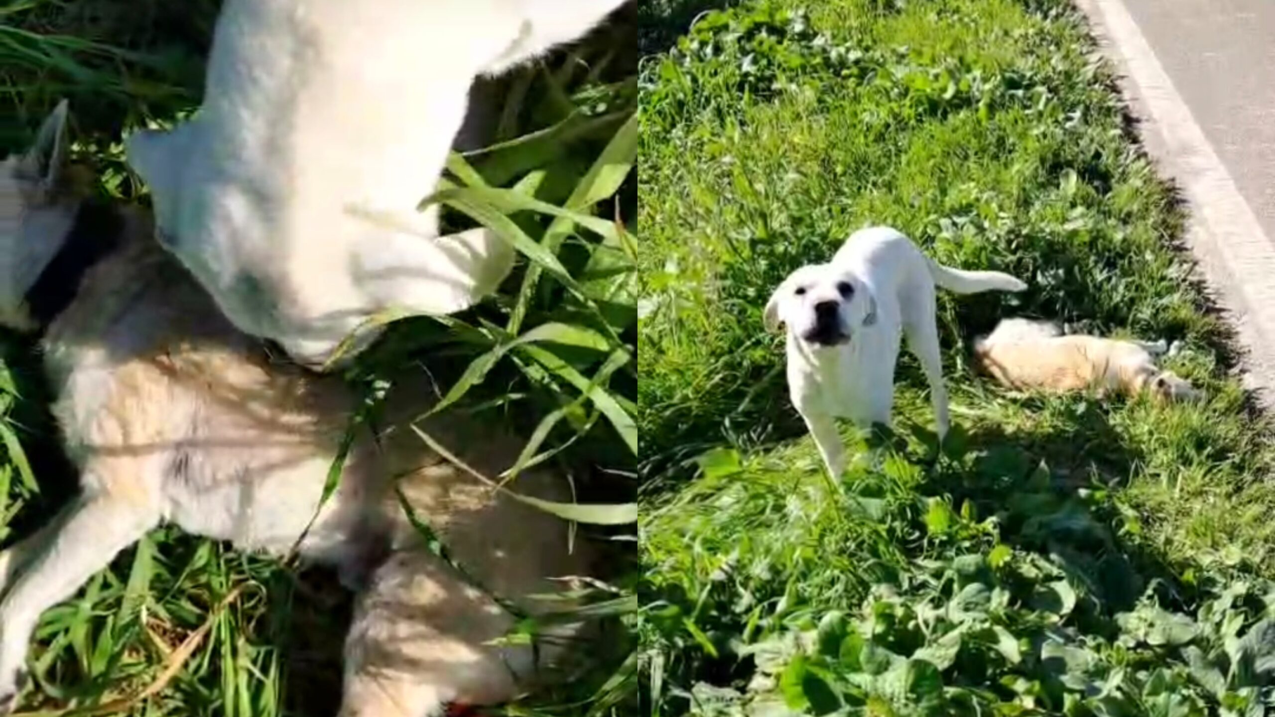 È stata una ciclista a notare gli animali, si è fermata e ha visto un cagnolone bianco fermo e sdraiato sull’amico morto sicuramente da ore. È molto docile, si è fatto accarezzare ma non si vuole allontanare dal corpo del cane deceduto.