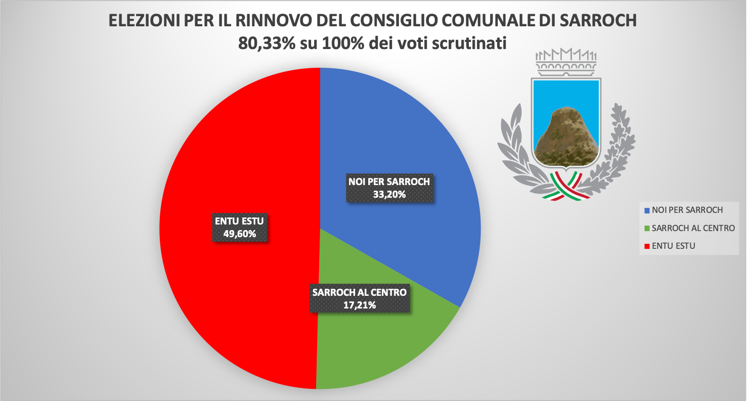 A Sarroch con l’80 per cento dei voti scrutinati alle 18:30, in testa il candidato sindaco Angelo Dessì con la lista Entu Estu (49,61), segue Mirko Piga alla guida della lista Noi per Sarroch (33,20%) e Sarroch al centro (17,21%) con Massimiliano Salis.