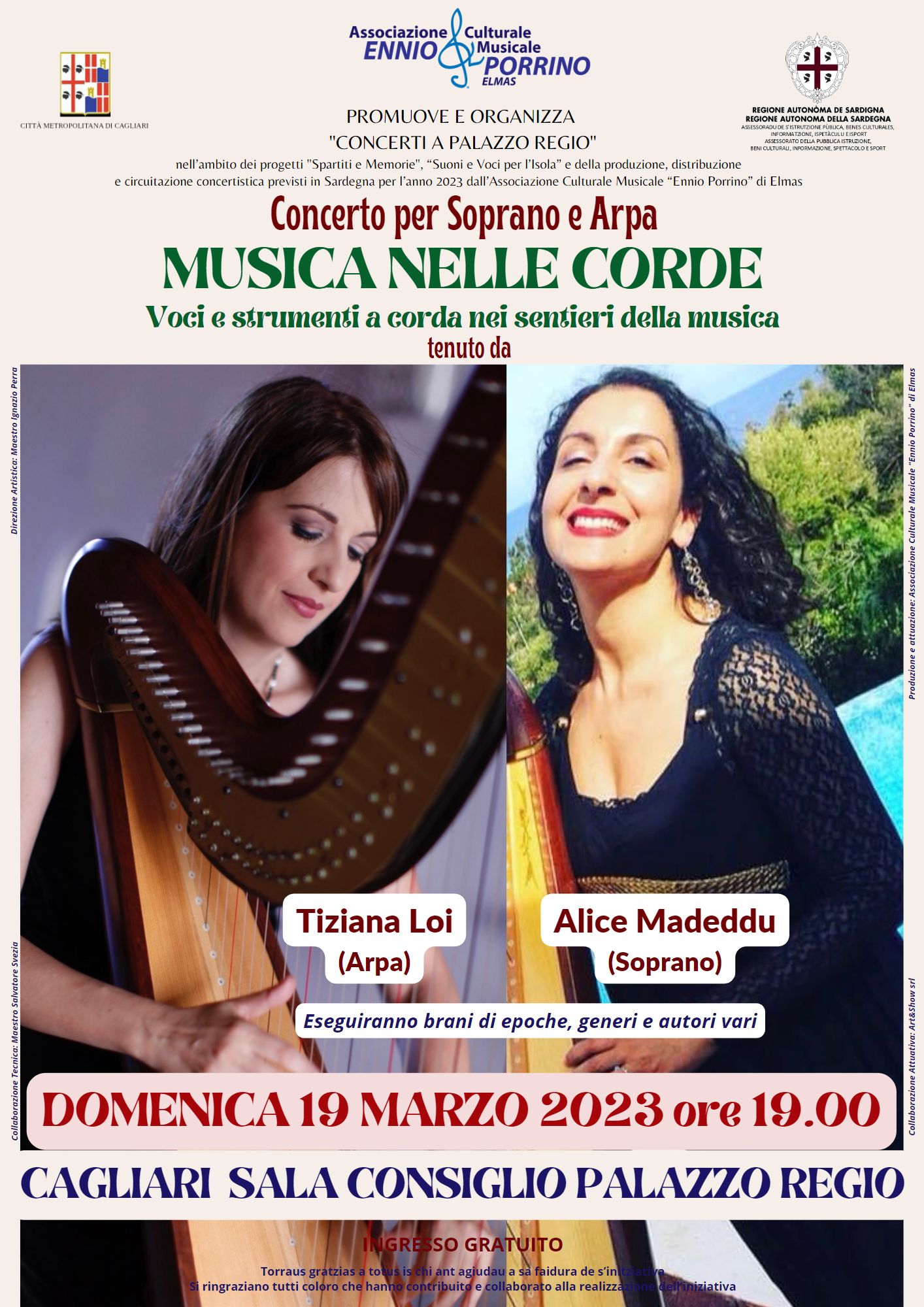 Domenica 19 marzo 2023 prosegue la Rassegna “Concerti a Palazzo Regio” che vedrà protagoniste due grandi professioniste dell’ambito musicale classico e colto, il soprano Alice Madeddu e l’arpista Tiziana Loi. Con il concerto “MUSICA NELLE CORDE – Voci e strumenti a corda nei sentieri della musica”, che si terrà presso la Sala Consiglio del Palazzo Regio di Cagliari (con inizio alle ore 19.00), il duo cameristico proporrà un percorso caratterizzato da trame musicali raffinate con l’esecuzione di brani classici e contemporanei, pure legati alla tradizione musicale sarda, di coinvolgente impatto sonoro.