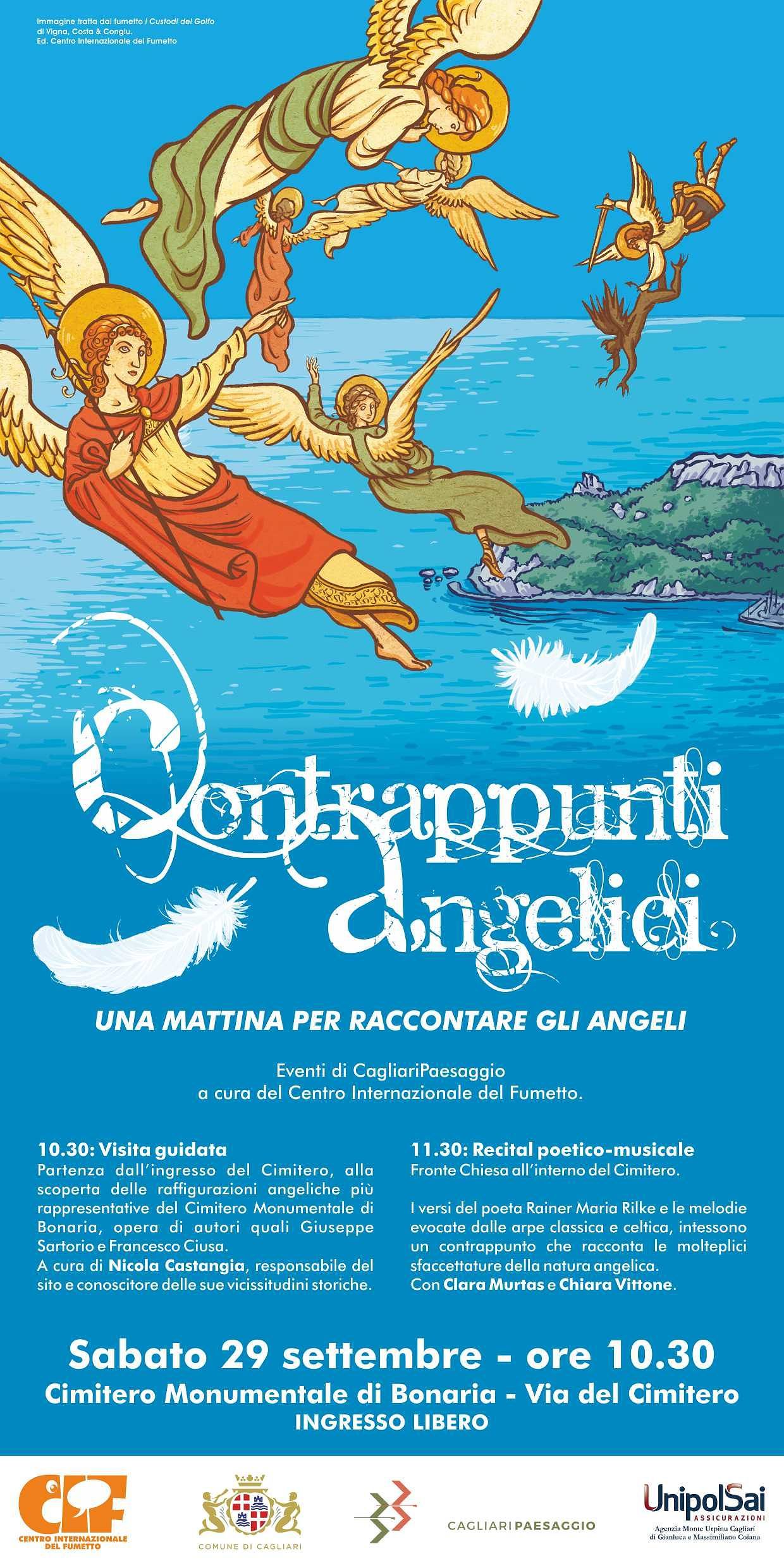 Musica, letteratura e scultura tessono assieme un vero e proprio contrappunto angelico: sabato 29 settembre, a Cagliari, al Cimitero Monumentale di Bonaria, un doppio appuntamento anticipa la stagione autunnale delle attività del Centro Internazionale del Fumetto, diretto da Bepi Vigna. Contrappunti Angelici, questo il titolo, intende raccontare la figura mitologica e religiosa dell’angelo, a cui la città è particolarmente legata grazie alla leggenda del Golfo degli Angeli e della Sella del Diavolo, attraverso una visita guidata e un recital poetico-musicale.