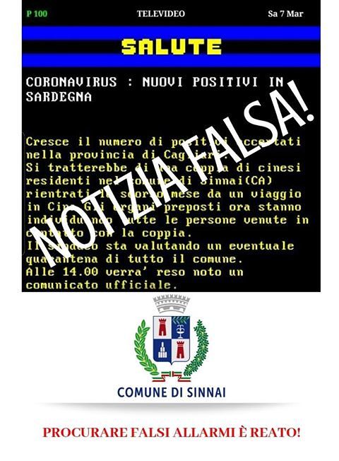 Coronavirus, fake news a Sinnai, il sindaco e il Comune denunciano alla Polizia Postale: “Nessun contagio in paese”. Immediata smentita del sindaco di Sinnai Tarcisio Anedda contro la diffusione di un falso Televideo con falsi notizie su contagi a Sinnai, definiti inesistenti dall’amministrazione comunale: “La notizia che si sta diffondendo in questo momento attraverso WhatsApp e nei social è assolutamente falsa. Qualsiasi notizia riguardante la salute pubblica viene trasmessa attraverso i canali istituzionali, quali sito e albo pretorio del comune. Non c’è nessun caso di Covid19 nel nostro comune, anzi, ricordo che procurare falsi allarmi è reato!”, spiega il sindaco Tarcisio Anedda a Casteddu Online.