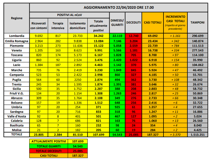 Il totale delle persone che hanno contratto il virus è 187.327, con un incremento rispetto a ieri di 3.370 nuovi casi. Il numero totale di attualmente positivi è di 107.699, con un decremento di 10 rispetto a ieri. Restano alti i decessi: 437 che portano il totale a 25.085.