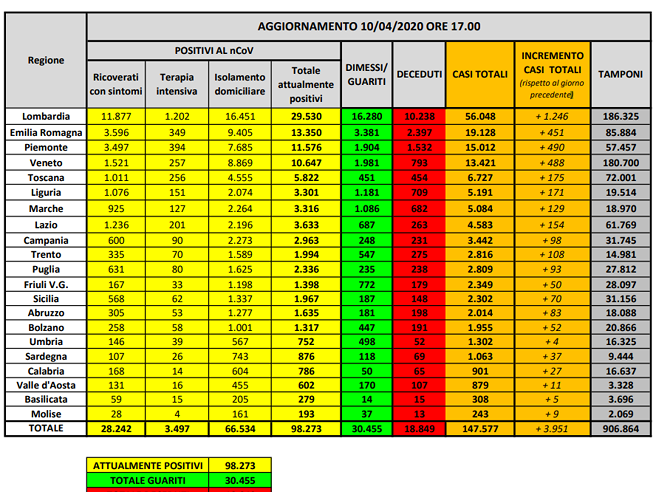 Coronavirus in Italia, la curva torna a calare: scendono i morti e i contagiati, tutti i numeri di oggi. Complessivamente 147.577 persone sono risultate positive da inizio epidemia, con un incremento rispetto a ieri di 3.951, il 2,7 per cento in più. Attualmente sono 98.273 le persone malate, in crescita di 1.396 rispetto alle 24 ore precedenti. Sono 30.455 le persone guarite, con un aumento di 1.985. I deceduti sono 18.849, 570 in più. Continuano a scendere i ricoverati con sintomi, che sono ora 28.242, e in terapia intensiva, 3.497. Oggi ben 1985 persone guarite: si torna a sperare che il virus possa rallentare davvero