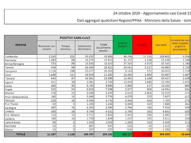 Coronavirus in Italia, sfiorati oggi i 20 mila contagi con 161 morti: Governo verso una nuova stretta. Oggi 19644 nuovi contagi del virus in Italia, circa 500 più di ieri, ma anche 70 morti in più in 24 ore, in tutto 161 decessi,. Numeri che confermano un trend in salita e portano Conte a un nuovo Dpcm: bar e ristoranti chiusi alle 18, stop a palestre e piscine, invito a non spostarsi dal Comune di residenza. Tutte misure al vaglio del comitato tecnico scientifico, in una riunione di emergenza in corso. Ci sono stati però oggi in Italia ben 2309 persone guarite dal virus.