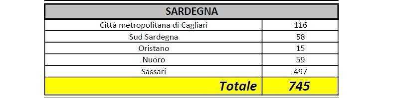 Sul territorio, dei 745 casi positivi complessivamente accertati, 116 sono stati registrati nella Città Metropolitana di Cagliari (+5 rispetto al dato precedente), 58 nel Sud Sardegna, 15 (+5) a Oristano, 59 (+2) a Nuoro, 497 (+11) a Sassari.