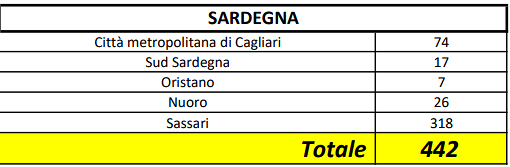 Sono 442 i casi totali di coronavirus che si sono registrati in Sardegna, dall’inizio dell’epidemia, secondo l’ultimo bollettino della Protezione Civile. Rispetto a ieri i contagi salgono “solo” di 21 unità. Le morti passano invece da 15 a 18. I guariti sono 12. In totale nell’Isola sono stati fatti 3.019 tamponi. Nello schema di seguito la ripartizione per provincia dei contagi: è sempre Sassari con 318 casi a destare maggiore preoccupazione. Anche perché la maggior parte di questi sono avvenuti all’interno degli ospedali.