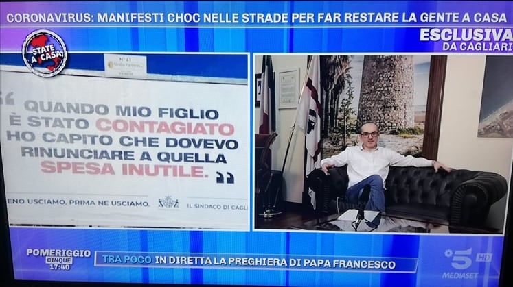 “Colpire gli irresponsabili”. Così il primo cittadino di Cagliari Paolo Truzzu in diretta su Pomeriggio Cinque, la trasmissione condotta da Barbara D’Urso ha spiegato la scelta dei cartelloni coi messaggi choc sull’emergenza coronavirus che invitano i cagliaritani a stare in casa. La campagna informativa ha acceso forti polemiche. “Ci sono persone che vanno 3 volte al giorno a fare la spesa”, ha dichiarato Truzzu, “e ci sono scontrini anche da 3 o 5 euro. Sembra non sia possibile fare una rinuncia, sembra tutto fondamentale. Ma dobbiamo stare a casa. E questo va detto anche in modo brutale. La maggior parte si comporta bene, ma basta un’irresponsabile per rovinare tutto e allungare questa agonia. E ricordo che noi sindaci siamo garanti della tenuta del sistema.” “Amici sardi state a casa siamo tutti italiani”, ha esortato la D’Urso, “e ricordatevi che i sindaci lo fanno per noi”.