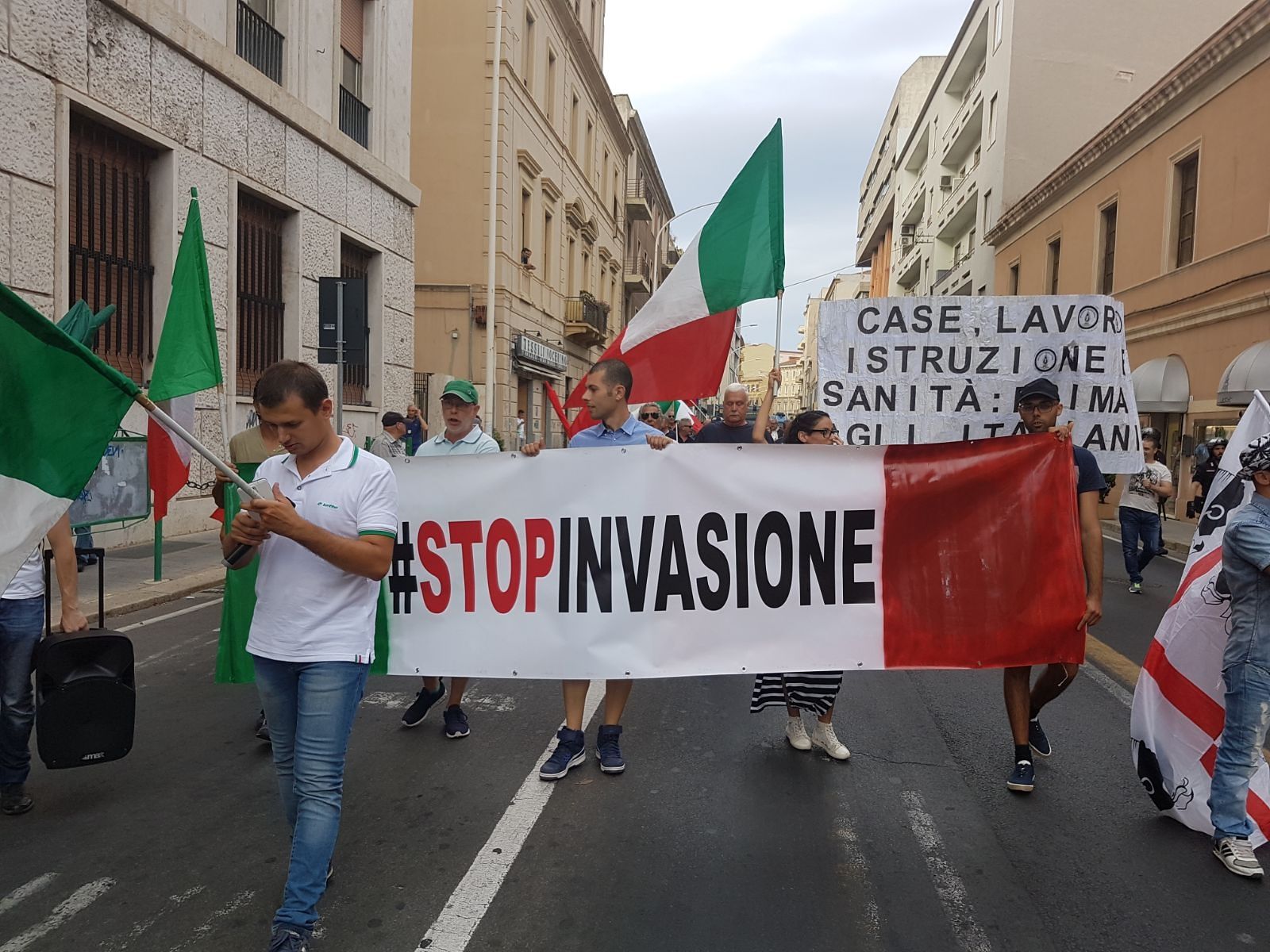 Prima gli insulti, poi il lancio dei limoni e poi anche i colpi. Contuso un carabiniere scivolato in via Roma durante gli scontri. Pomeriggio di tensione in centro città. Da piazza Repubblica è partito il corteo organizzato dal Movimento sociale sardo contro l’accoglienza ai migranti. Da una parte una cinquantina i partecipanti con lo striscione “stop invasione” e dietro “Case, lavoro, istruzione e sanità: prima gli italiani”. Dall’altra il coordinamento antifascista, anche loro una cinquantina, in piazza per denunciare l’illegittimità della manifestazione del Movimento sociale, con gli striscioni “Teniamo pulita la città” (in riferimento ai “fascisti”) e “Welcome refugees”, tra i cori “Caruso contuso” e “fascisti carogne tornate nelle fogne”. Attorno decine di agenti e almeno sei mezzi blindati di polizia, carabinieri e Guardia di Finanza che hanno scortato la manifestazione del Movimento sociale.