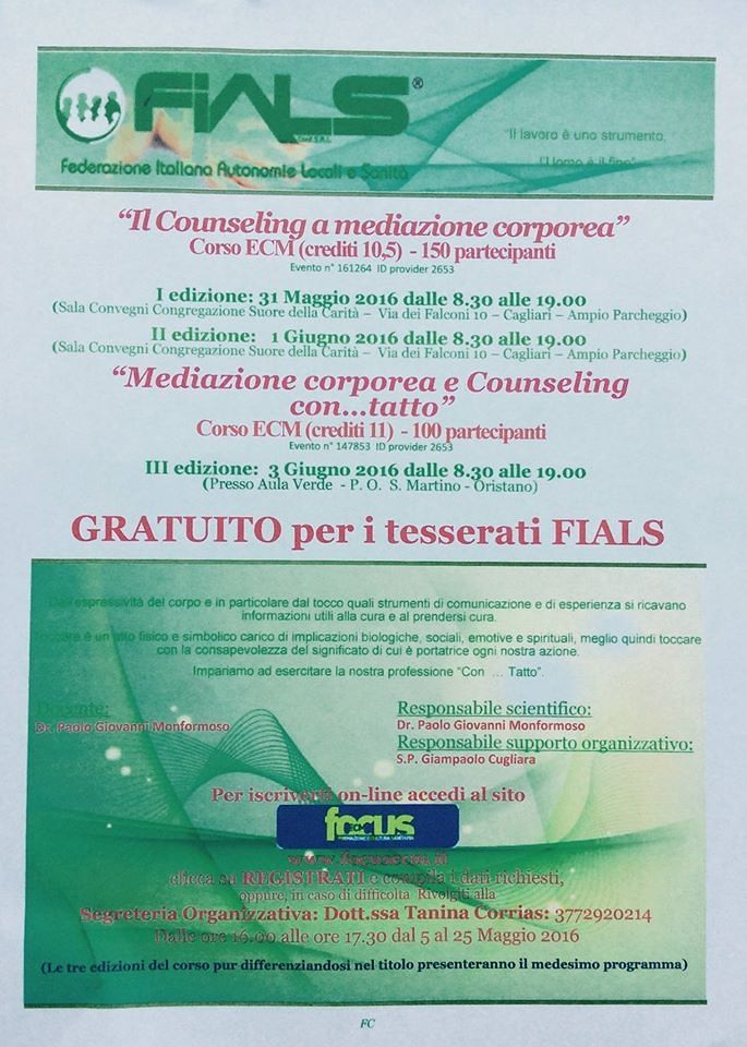 Si terrà a Cagliari, il 31 maggio e il 1 giugno, dalle 8:30 alle 19, presso la sala convegni Congregazione suore della carità, in via dei Falconi, il corso di formazione, organizzato dalla Fials, destinato alla formazione continua in ambito medico per per gli addetti all’assistenza, dal tema “Il counseling a mediazione corporea”. Il corso vale 10,5 crediti formativi.