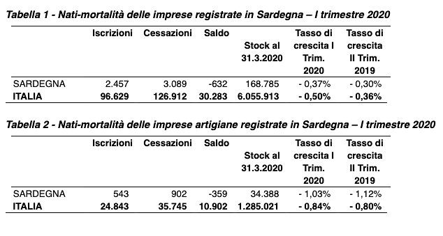 Quasi 650 imprese in meno nei primi tre mesi del 2020 di cui 359 artigiane. E’ il bilancio della nati-mortalità delle imprese sarde tra gennaio e marzo fotografato da Movimprese, la rilevazione condotta sui Registri delle imprese delle Camere di commercio italiane da Unioncamere-InfoCamere sulla natalità e mortalità delle imprese italiane nel primo trimestre 2020.