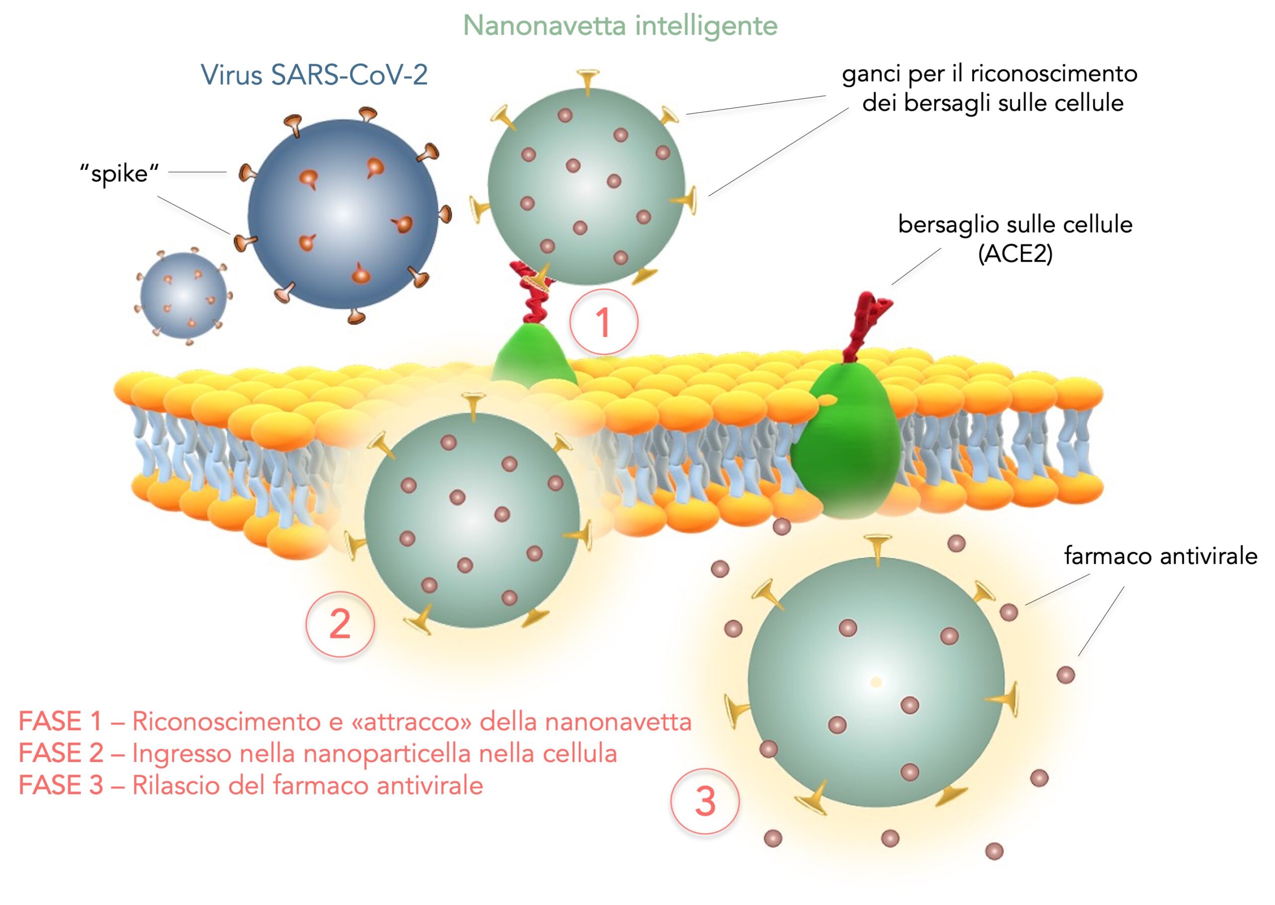 La ricerca ha portato alla realizzazione di nanoparticelle di dimensioni simili a quelle del virus, caricate con il farmaco antivirale Remdesivir, utilizzato come modello, e di recente approvato per il trattamento della malattia COVID-19; queste nanoparticelle sono state ingegnerizzate in superficie con piccoli “gancetti” capaci di riconoscere e di interagire con delle strutture specifiche (denominate “ACE2”), presenti sulla superficie delle cellule del tessuto polmonare: esse costituiscono il sito di riconoscimento per il SARS-CoV-2 per l’ingresso e quindi l’infezione nelle cellule. La presenza di questi “ganci molecolari”, nel favorire l’interazione (o “attracco”) tra il nanovettore e le cellule principalmente localizzate nell’apparato respiratorio, consente la veicolazione selettiva del farmaco verso tali bersagli.