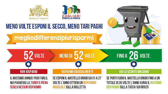 Dal 1° gennaio 2021 tutte le famiglie della città di Cagliari possono risparmiare grazie all’introduzione del Tributo Puntuale, il nuovo modo di calcolare la tassa sui rifiuti che tiene conto del numero di volte che viene esposto il rifiuto secco indifferenziato, ovvero quello nel mastello grigio da 45 litri.