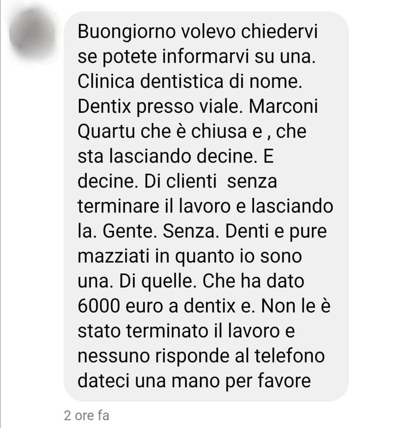 Alla redazione di Casteddu Online è arrivato, nel pomeriggio, il messaggio-sos di una donna residente a Cagliari, Adelaide C.: “La clinica dentistica di nome Dentix presso viale Marconi a Quartu è chiusa, io sono una delle clienti che ha dato seimila euro e non le è stato terminato il lavoro e nessuno risponde al telefono”. Del caso è stata informata anche la sezione cagliaritana dell’Adiconsum.