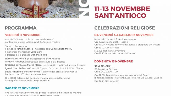 Sant’Antioco si prepara a vivere una tre giorni di celebrazioni, dall’11 al 13 novembre, omaggio al “Dies Natalis” di S.Antioco Martire, Patrono di Sardegna. Il 13 novembre è la ricorrenza della morte del Santo e rappresenta uno dei tre momenti in cui nel corso dell’anno si celebra il culto di Antioco. Per questo, l’Amministrazione Comunale ha deciso di dare centralità anche a questa ricorrenza, oltre alla “Festa Manna” che ricorre 15 giorni dopo Pasqua, e alla Festa del primo di agosto, con un cartellone di appuntamenti che spazia tra cultura, approfondimento storico, tradizione e fede. Ed eccezionalmente, occasione unica, grazie alla Diocesi di Iglesias e al rettore della Basilica Don Mario Riu, si potrà assistere a una solenne processione del Santo che sfilerà per alcune vie del centro storico domenica 13 novembre. Senza dimenticare l’omaggio musicale al Santo a cura del Coro di Neoneli, in Basilica sabato 12.