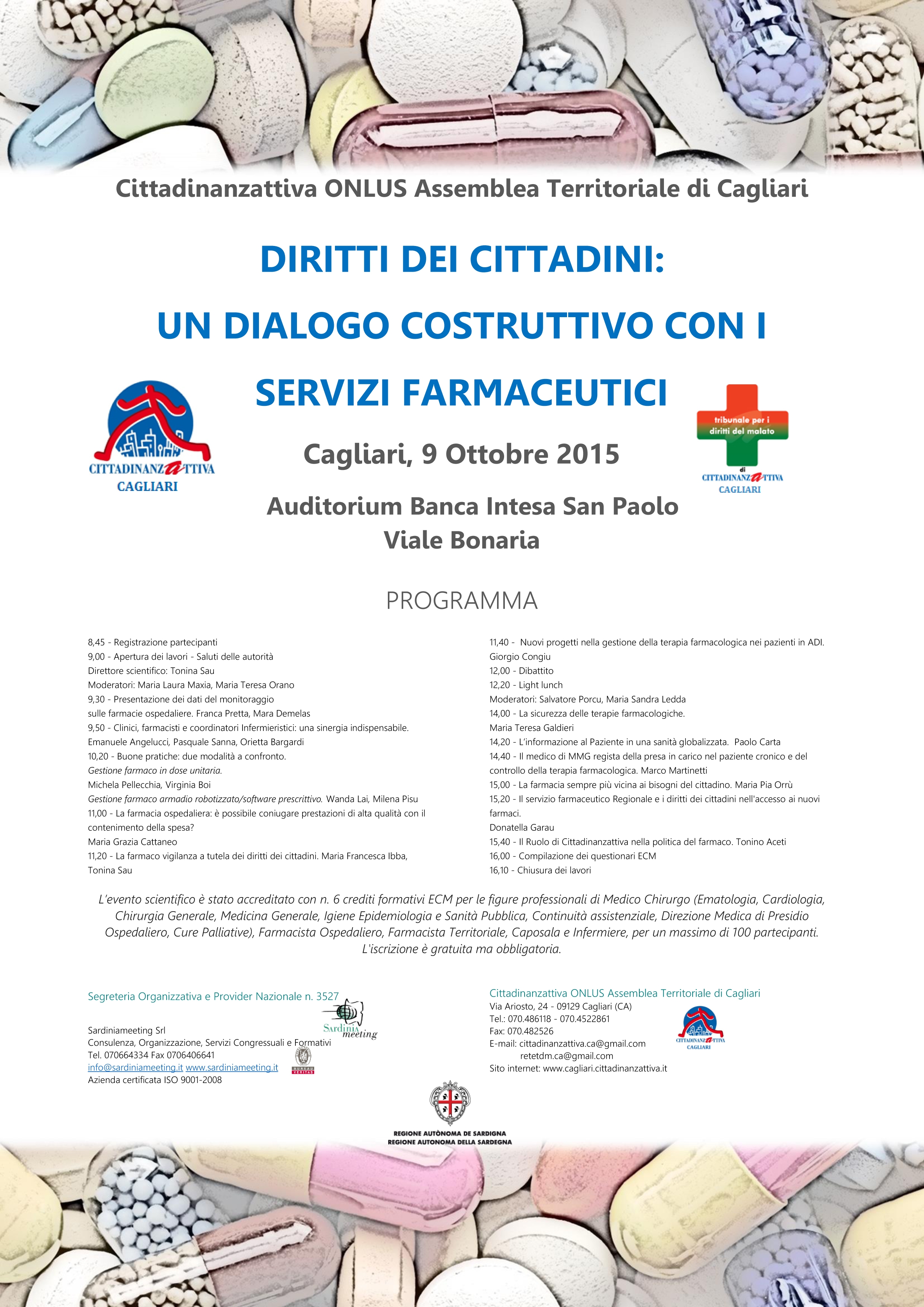 Rete del Tribunale per i Diritti del Malato, organizza venerdì 9 ottobre 2015 a Cagliari, presso l’Auditorium della Banca Intesa San Paolo, in Viale Bonaria, una giornata formativa e di confronto tra i diversi operatori dei Servizi Farmaceutici e i cittadini dal titolo “Diritti dei cittadini: un dialogo costruttivo con i Servizi Farmaceutici”.