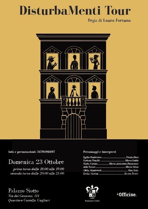 Domenica 23 ottobre Palazzo Siotto ospiterà lo spettacolo “Distrubamenti Tour”, per la regia di Laura Fortuna. Due repliche, una dalle 18.00 alle 19.00 e una dalle 20.00 alle 21.00.