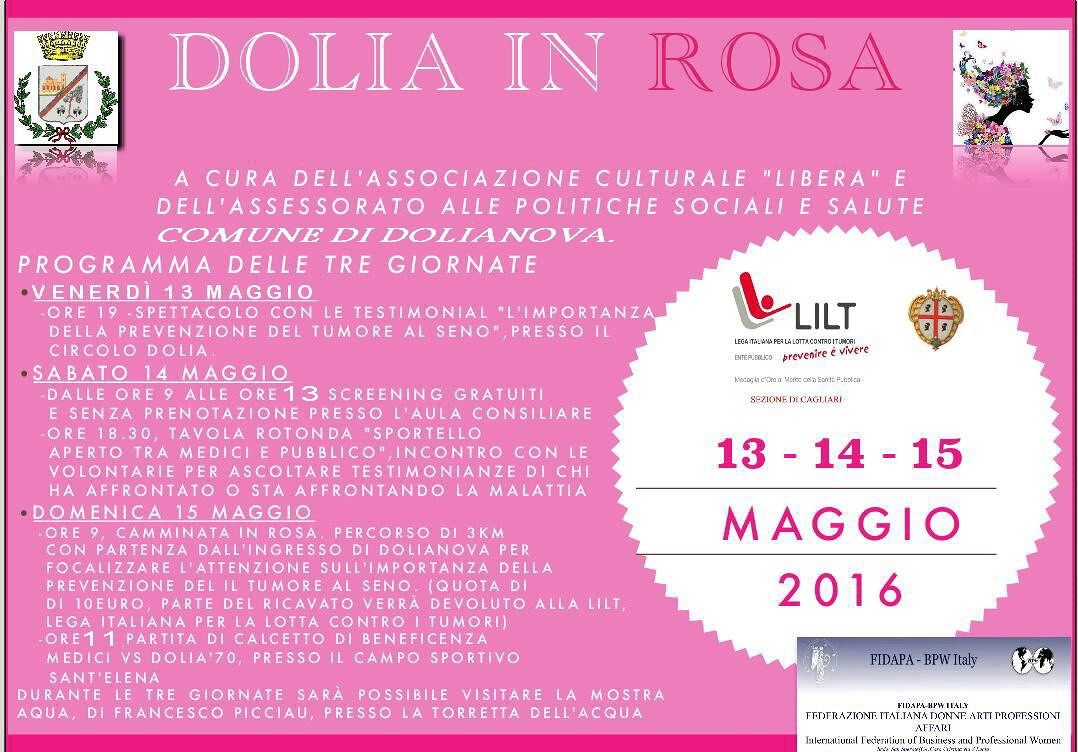 “La Camminata in Rosa”: sport e solidarietà si uniscono per uno scopo benefico e di utilità sociale per la lotta ai tumori. Ecco la tre giorni, promossa dal Comune di Dolianova e dall’associazione “Libera” che avrà luogo il 13/14 e 15 maggio con una serie di iniziative, screening gratuiti e manifestazioni: partecipare è semplice, dicono gli organizzatori, basta percorrere con noi 3 chilometri per mantenere viva l’attenzione sulla prevenzione del tumore al seno, il costo dell’iscrizione è di 10 euro che comprende una maglietta con il logo, una bottiglietta d’acqua e un frutto. Parte del ricavato sarà interamente devoluto alla Lega Italiana Contro i Tumori. L’appuntamento è alle ore 9 al parchetto all’ingresso di Dolianova, partenza ore 9.30 e arrivo presso il campo sportivo S.Elena; ci sarà la partita del cuore tra medici e la formazione Dolia 70 ed infine verranno liberati in volo i palloncini rosa. E’ possibile iscriversi contattando il recapito telefonico392/7596836 (Denise). In allegato la locandina delle tre giornate con gli altri appuntamenti previsti.
