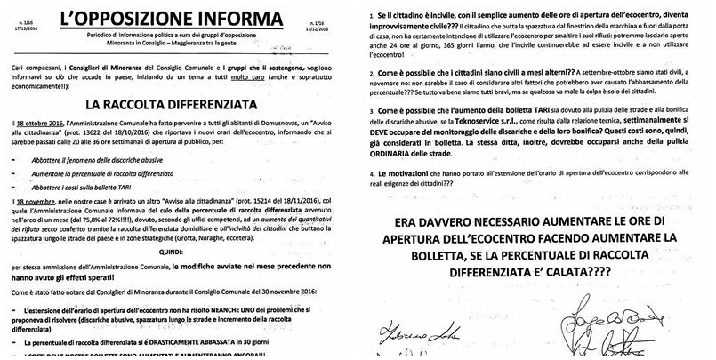 Raccolta differenziata, estensione oraria dell’ecocentro, maggior costo a carico dei cittadini. Ne sono convinti i consiglieri di minoranza di Domusnovas, che in un documento cartaceo “L’Opposizione Informa” lanciano una stilettata sul caro-rifiuti: “Cari compaesani – si legge – vogliamo informarvi su ciò che accade in paese iniziando con un tema molto caro, ossia la raccolta differenziata. In data 18 ottobre 2016 l’amministrazione ha fatto pervenire a tutti i cittadini un avviso che riportava i nuovi orari dell’ecocentro e che si sarebbe passati dalle 20 alle 36 ore settimanali di apertura al pubblico per abbattere il fenomeno delle discariche abusive, aumentare la percentuale della differenziata e abbattere i costi sulla bolletta Tari. Il 18 novembre nelle nostre case è arrivato un altro avviso con il quale l’amministrazione avvisava del calo di percentuale di raccolta avvenuta in un mese (dal 75.8% al 72%) dovuto secondo gli uffici competenti ad un aumento dei quantitativi del secco conferito tramite la raccolta domiciliare e all’inciviltà dei cittadini che buttano la spazzatura lungo le strade del paese e in zone strategiche, nelle grotte o nei nuraghi. Quindi – prosegue il documento – i costi delle bollette aumenteranno con questi relativi costi deliberati dalla giunta, ossia per l’incremento orario del sito dove si va a conferire con costi di 6.500 euro più iva per il periodo 1° ottobre fino al 31 dicembre 2016 e 26mila euro più va per il periodo gennaio-dicembre 2017. A questo punto – denunciano i consiglieri – era davvero giusto incrementare le ore di apertura della struttura quando le percentuali dei rifiuti non danno risultati sperati ed invece i costi aumentano per le tasche dei contribuenti”?