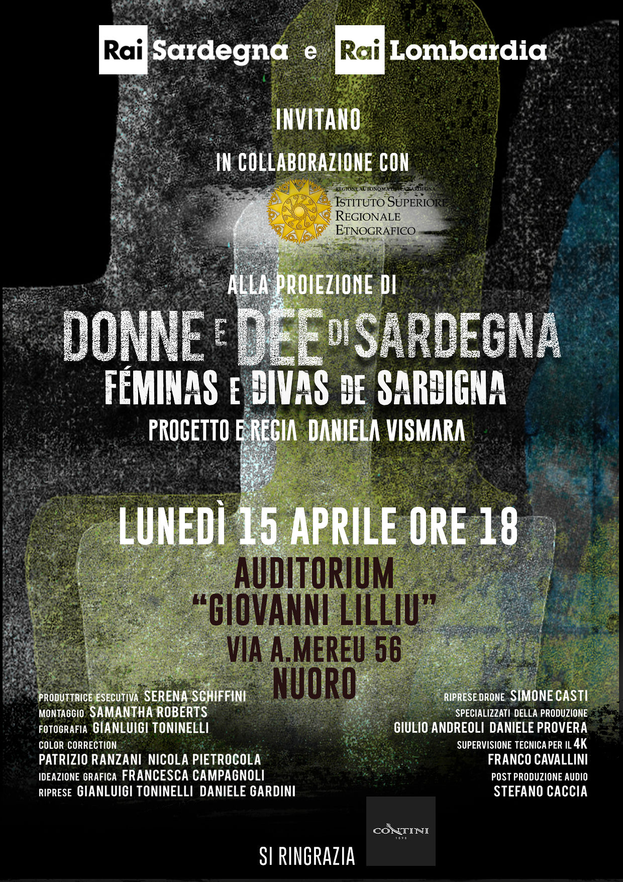 Il documentario prodotto da Rai Sardegna in collaborazione con il Centro di Produzione Rai di Milano, Donne e Dee di Sardegna – Féminas e Divas de Sardigna conduce lo spettatore, attraverso la testimonianza di donne che vivono e lavorano nell’Isola, in luoghi arcaici e contemporanei inseguendo le tracce di antiche divinità femminili di cui l’isola ancora conserva numerosi reperti.