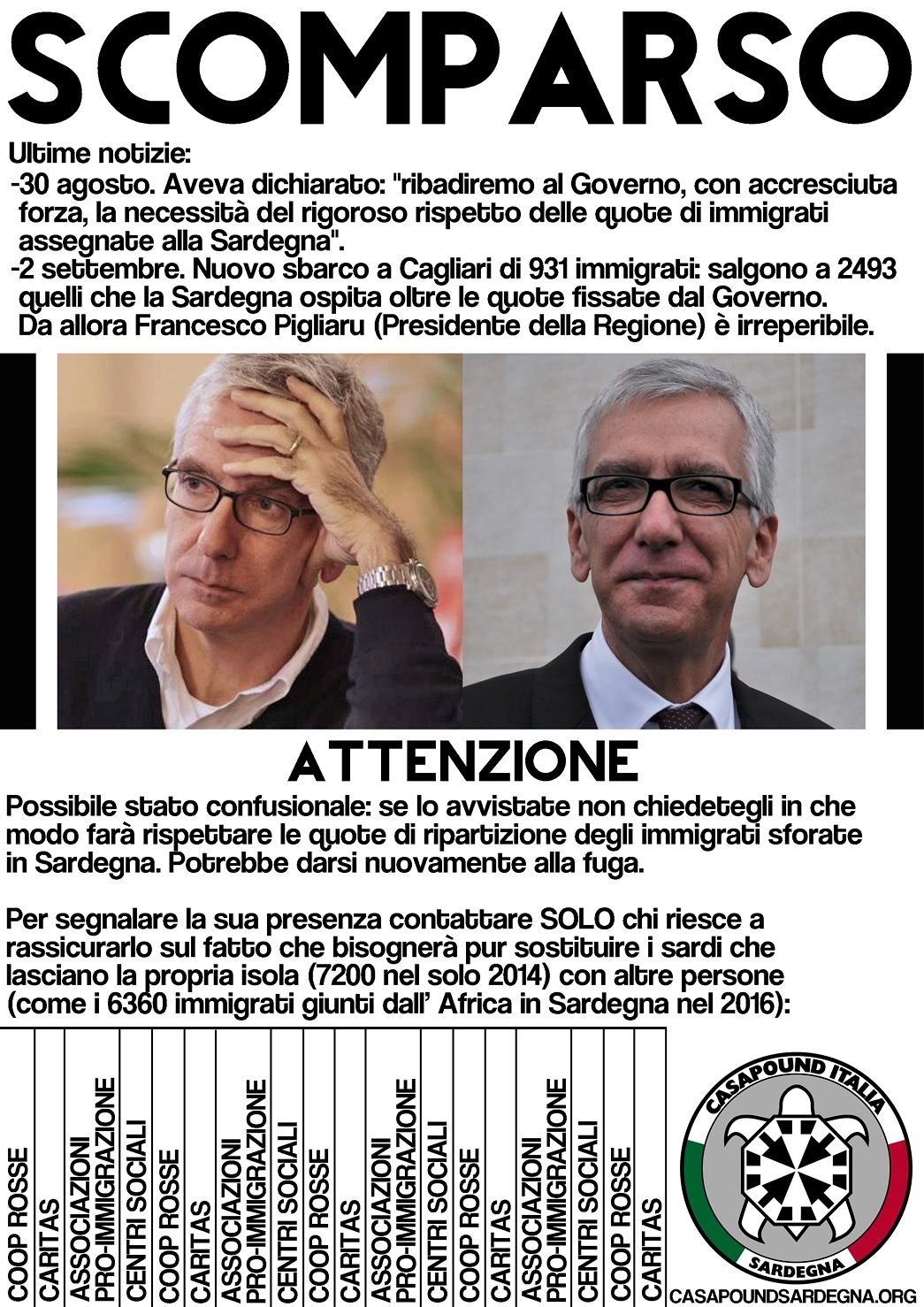 “Attenzione, probabile stato confusionale: se lo avvistate non chiedetegli in che modo farà rispettare le quote di ripartizione degli immigrati già ampiamente sforate in Sardegna. Potrebbe darsi nuovamente alla fuga”. Con queste parole CasaPound dà l’allarme della “scomparsa” del Presidente della Regione Pigliaru su centinaia di manifesti nelle province di Cagliari, Sassari e Carbonia.