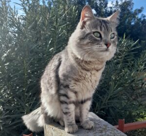 È un gatto adulto di circa 3/4 anni, castrato, dal pelo semilungo grigio , in alcuni punti sul tigrato, il pancino è bianco, la coda folta, occhi verdi con il pelo più lungo ai lati del mento.