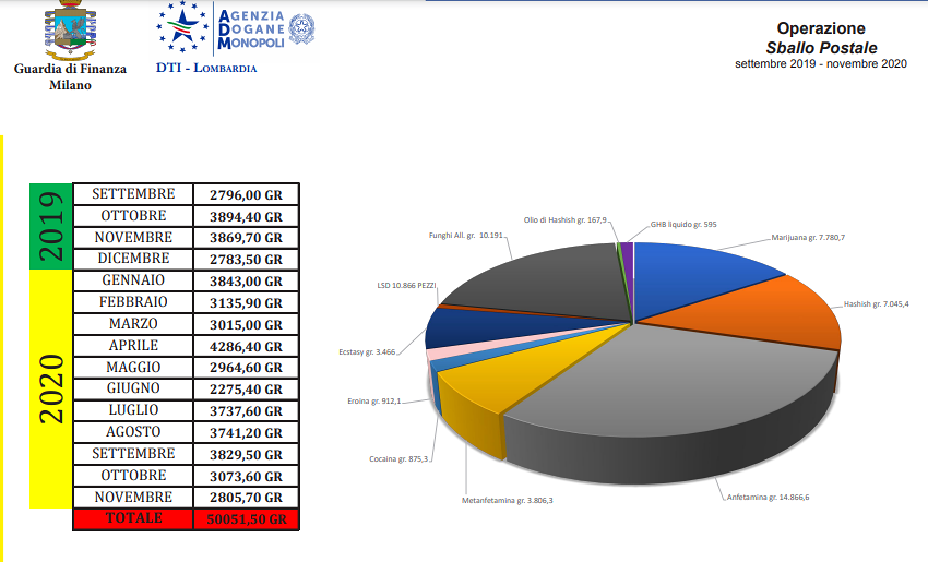 Dopo un anno di attività ininterrotta in stretta sinergia operativa, sono stati sequestrati 50 kg di sostanze stupefacenti nascoste dentro biglietti di auguri, incollate alle cartoline, racchiuse tra le pagine dei libri, perfino nelle confezioni di cerotti. L’enorme quantitativo sequestrato riguarda il controllo dell’autotreno che quotidianamente proviene dai Paesi Bassi e la cui analisi hanno consentito di rinvenire quasi 15 kg di anfetamina e 4 kg di metanfetamina, sia allo stato solido che liquido, 2 kg tra cocaina ed eroina, 15 kg tra hashish e marijuana, oltre 10.000 francobolli di LSD e 10 kg di funghi allucinogeni, fino ai 600 grammi di GHB, la droga liquida comunemente detta “dello stupro”, che solo con alcune gocce è in grado di inibire la capacità di intendere e volere dell’assuntore.