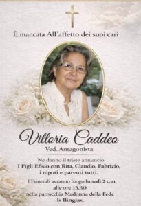 Ne danno il doloroso annuncio il figlio Efisio con Rita, Claudio, Fabrizio e tutti i nipoti, che la porteranno per sempre nel cuore.