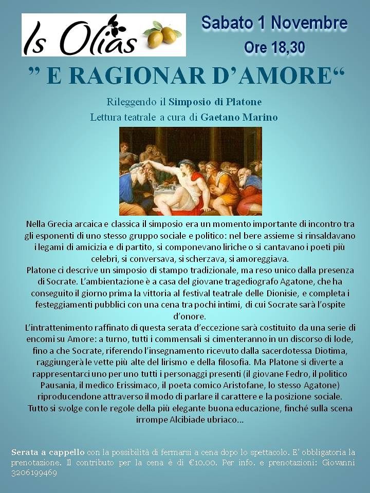 Gaetano Marino, autore, attore. regista e cantastorie ci rappresenterà in maniera originale il “Simposio” di Platone, dove a casa del giovane tragediografo Agatone e con la presenza di Socrate, i commensali si cimenteranno in un discorso di lode dell’Amore.