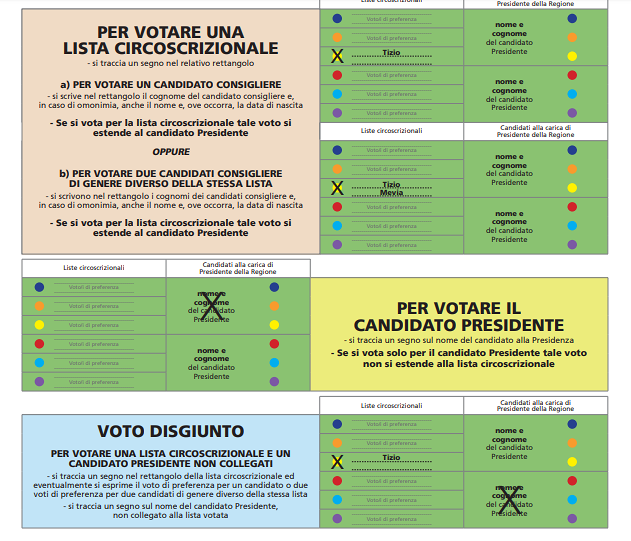 Sulla scheda l’elettore può esprimere il proprio voto sia per un candidato alla Presidenza della Regione sia per una qualunque delle liste circoscrizionali, anche non collegata al Presidente votato.