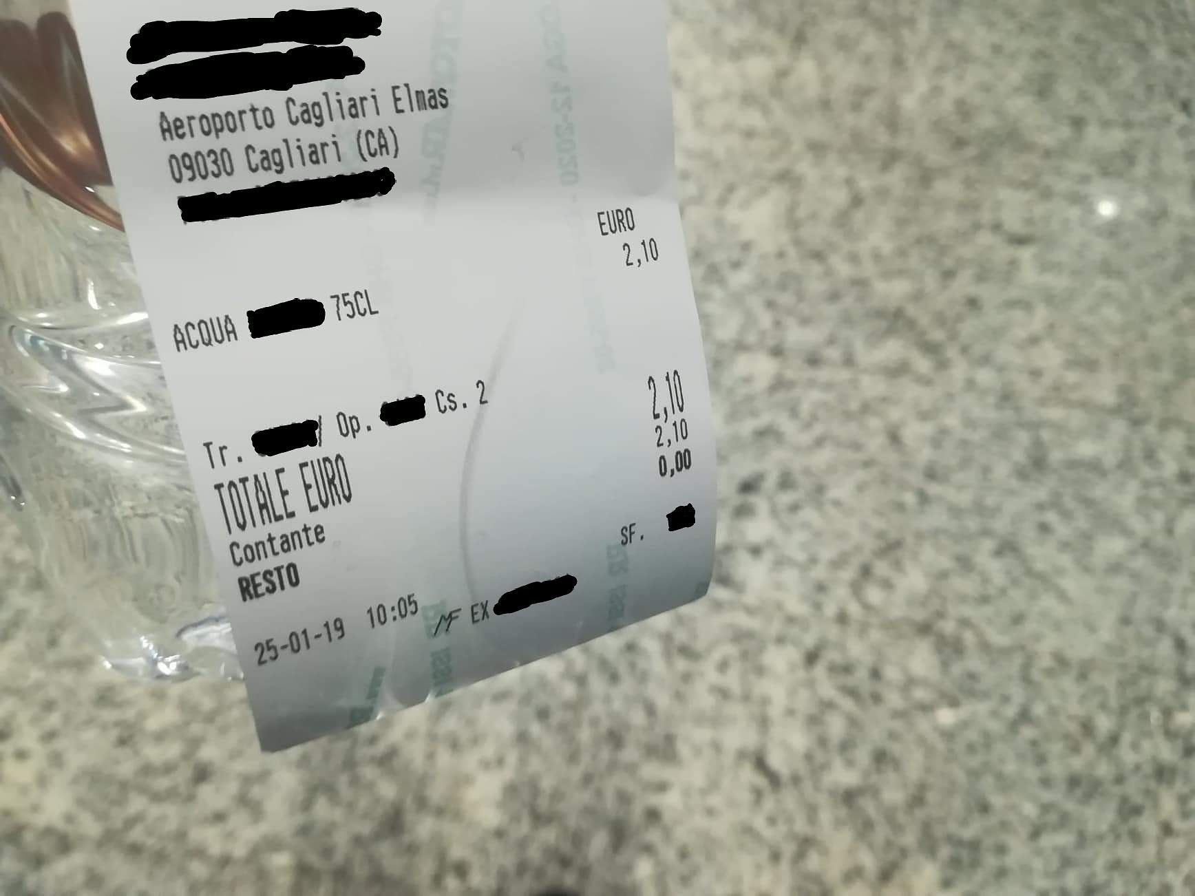 Una bottiglietta d’acqua decisamente “salata”, non perché riempita di acqua marina ma per il costo. Succede all’aeroporto di Elmas, in uno dei bar presenti tra il settore degli arrivi e quello delle partenze. Lo scontrino recita “acqua 75 cl” , totale “2,10 euro”. A farlo arrivare alla nostra redazione è una lettrice, I. O. E il commento sarcastico, a contorno, è scontato