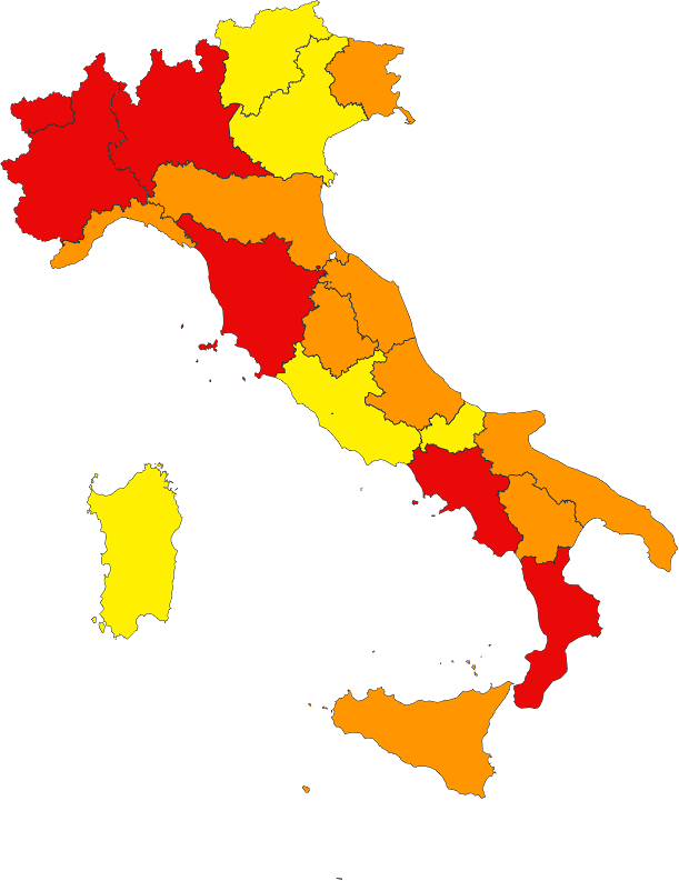Emergenza Coronavirus: cambia ancora la mappa ‘colorata’ delle tre zone d’Italia (gialla, arancione e rossa), in cui sono suddivise le Regioni in base ai 21 parametri, decisi dal governo in accordo col Comitato tecnico scientifico. In fascia gialla solo Lazio, Veneto, Sardegna, Molise, Trento. L’assessore alla Sanità Nieddu temeva l’inserimento dell’Isola in fascia arancione, ma la Sardegna si è salvata e mantiene ancora solo le misure restrittive valide su tutto il territorio nazionale.