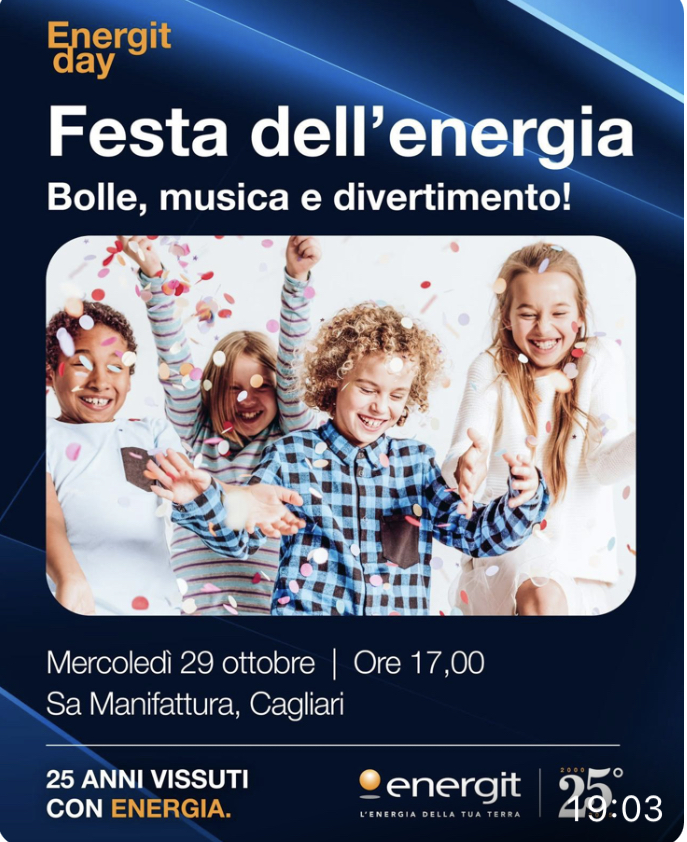 ● Energit Day – Giornata della Comunità. Mercoledì 29 ottobre, a partire dalle 17, una grande festa aperta al pubblico presso Sa Manifattura, Cagliari. La prima parte sarà dedicata ai bambini, con laboratori interattivi su sostenibilità ed energia. Successivamente, dalle 19, la festa proseguirà con momenti di intrattenimento e performance live, tra cui Moses Concas, lo speaker Matteo Bruni e il DJ Manuel Cozzolino, con la partecipazione di esponenti dello sport, tra cui una rappresentanza del Cagliari Calcio. Una giornata pensata per celebrare,