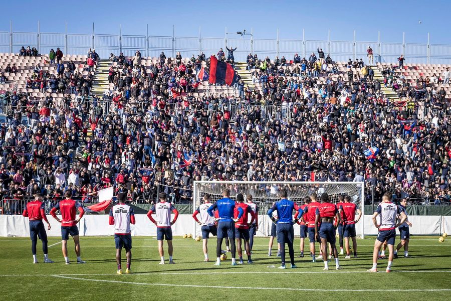 Allenamento a porte aperte all’Unipol Domus per i rossoblù di mister Ranieri, in campo per continuare la preparazione alla gara di Monza. Davanti a circa 3.300 tifosi, che hanno assiepato la Curva Nord, la squadra ha svolto degli esercizi di attivazione, poi dei lavori dedicati al possesso palla ed una partita.
