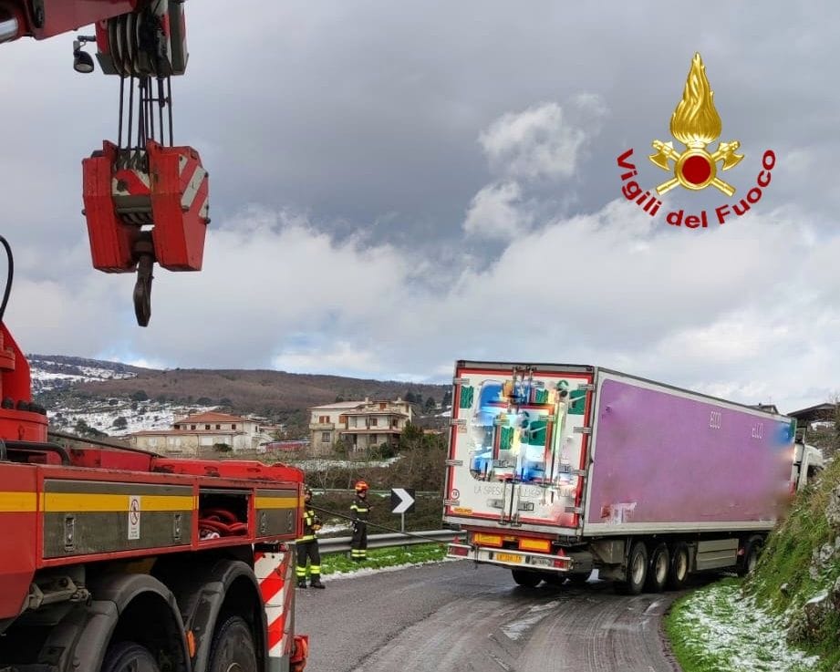 Probabilmente a causa delle nevicate e dell’asfalto ghiacciato, un autoarticolato è uscito di strada all’ingresso del comune di Santu Lussurgiu, nell’Oristanese. Per rimetterlo in carreggiata, visto il peso del mezzo, è stato necessario l’utilizzo di un’autogru. L’autista è rimasto illeso. Sul posto una squadra del Distaccamento di Abbasanta e l’AutoGru del Comando di Oristano. Dopo il soccorso il tir ha potuto riprendere la marcia.