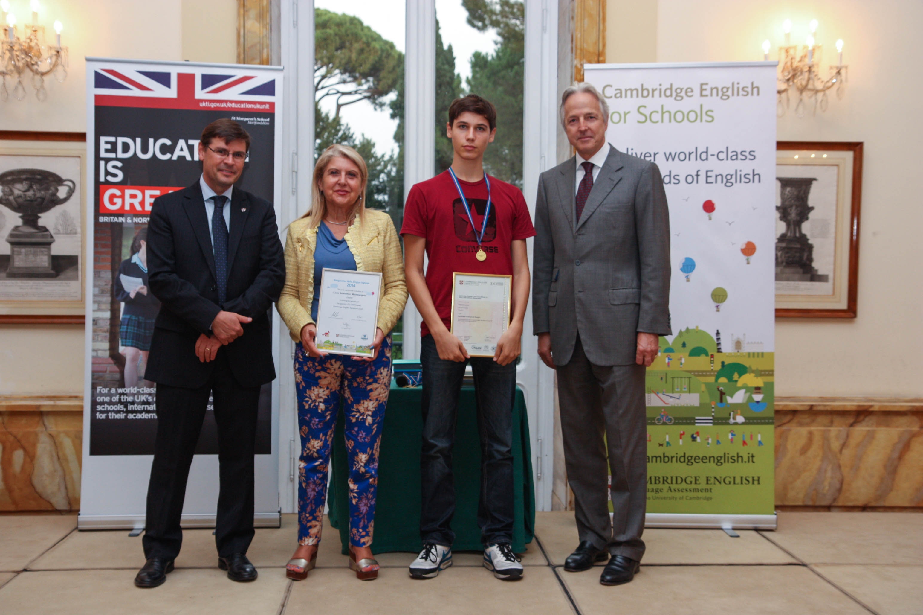 Sua Eccellenza Christopher Prentice, Ambasciatore Britannico in Italia ha consegnato il premio a Fabrizio che, oltre al riconoscimento e alla certificazione, si è aggiudicatoun soggiorno di studio in un paese anglofono. La cerimonia di premiazione degli studenti che hanno conquistato il podio del Kangourou della lingua inglese si è svolto martedì pomeriggio presso Villa Wolkonsky, la prestigiosa residenza ufficiale dell’ambasciatore britannico in Roma.