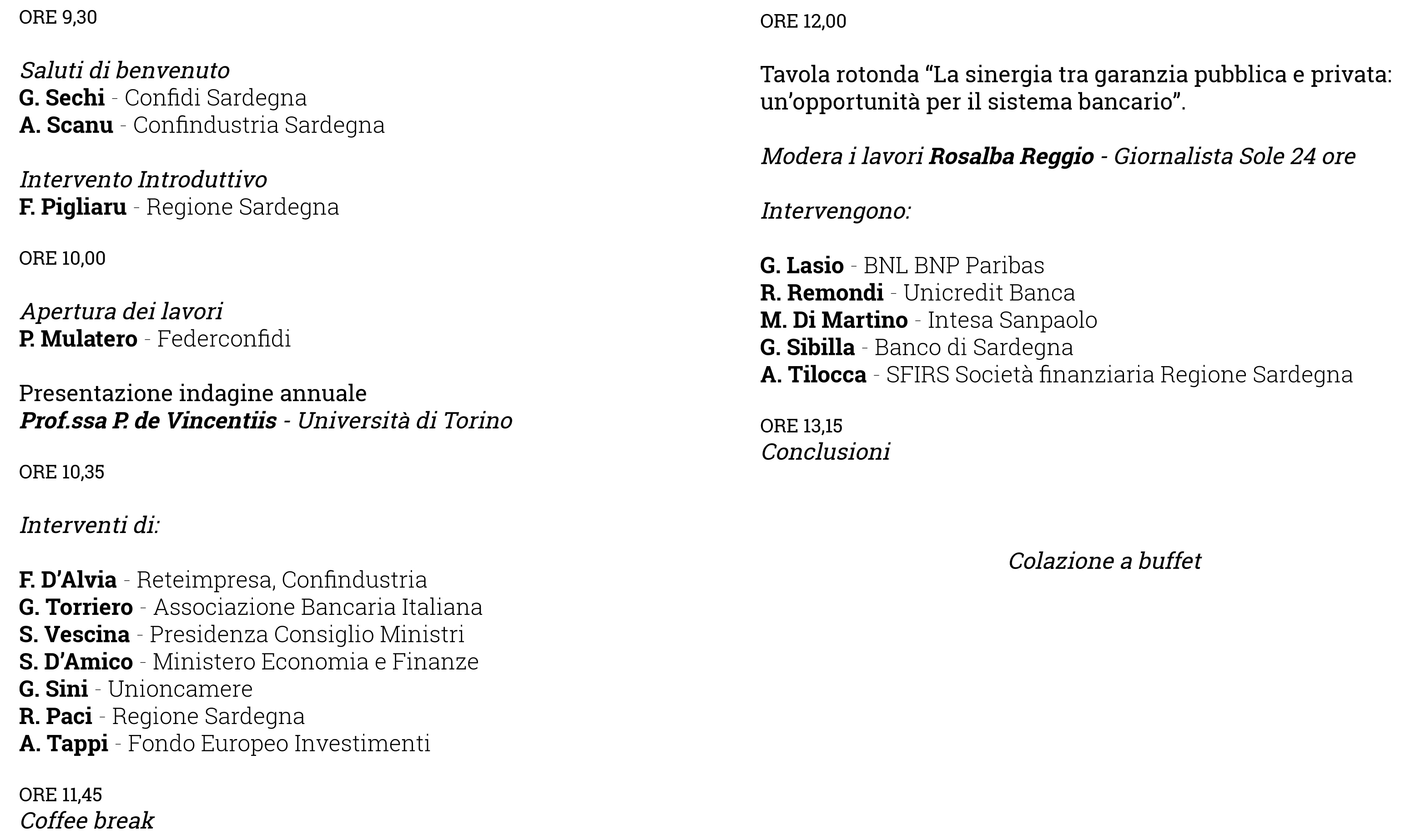Il Seminario tecnico si svolgerà a Palazzo Vice Regio il giorno 23 Ottobre a partire dalle ore 9.30 e vedrà la partecipazione e l’intervento del Presidente della Regione, Prof. Pigliaru e dell’Assessore Paci, oltre che del Presidente di Federconfidi e di importanti personalità del sistema Confindustria nazionale e regionale, degli Istituti Bancari nazionali e locali, del Ministero delle Finanze e della Presidenza del Consiglio dei Ministri.