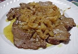 STUFARE LE CIPOLLE IN POCHI CUCCHIAI DI ACQUA. DISPORRE IL FEGATO INFARINATO TAGLIATO A PEZZETTI E LASCIARE CUOCERE