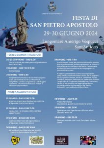 I principali riti religiosi della Festa del Patrono dei lavoratori del mare previsti per sabato 29, saranno preceduti da quelli del 26, 27 e 28 giugno (triduo alle 18.00) e dalle Sante Messe delle 7.30 e delle 10.30 del 29. Si entrerà nel vivo alle 12.00 di sabato con il trasporto del simulacro di San Pietro al porto percorrendo le vie Eleonora d’Arborea, Regina Margherita, Cavour, Lungomare, XXIV Maggio, Nazionale. Seguirà, alle 17.00, la processione a mare dal porto turistico della marina fino al porto canale (fronte Capitaneria) e rientro in processione col simulacro del Santo (le marinerie e i diportisti sono invitati ad accompagnare la processione a mare). Infine, corteo a terra con la banda musicale Santa Cecilia e rientro in parrocchia, dove seguirà la solenne celebrazione col panegirico del Santo in compagnia del coro polifonico di San Pietro.