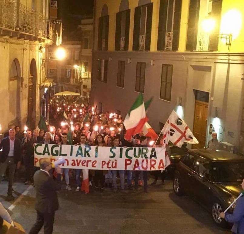 Qualche centinaio di persone (500 per Fdi che ha organizzato la manifestazione) ieri alla fiaccolata per la sicurezza nel rione Marina. C’è stato anche qualche momento di tensione, quando alcuni gruppi antifascisti hanno contestato il corteo. Oggi il coordinamento antifascista cagliaritano ha condannato la fiaccolata. “Ieri a Cagliari un tripudio di tricolori arrivati da mezza Sardegna”, si legge nelle pagina facebook del movimento, “fascisti scesi a dare manforte ai fascisti locali dopo la campagna dell’unione sarda e di altri giornali. Nel frattempo le statistiche parlano di una diminuzione dei reati del 10% a Cagliari, evidentemente la paranoia securitaria è solo un argomento da campagna elettorale.