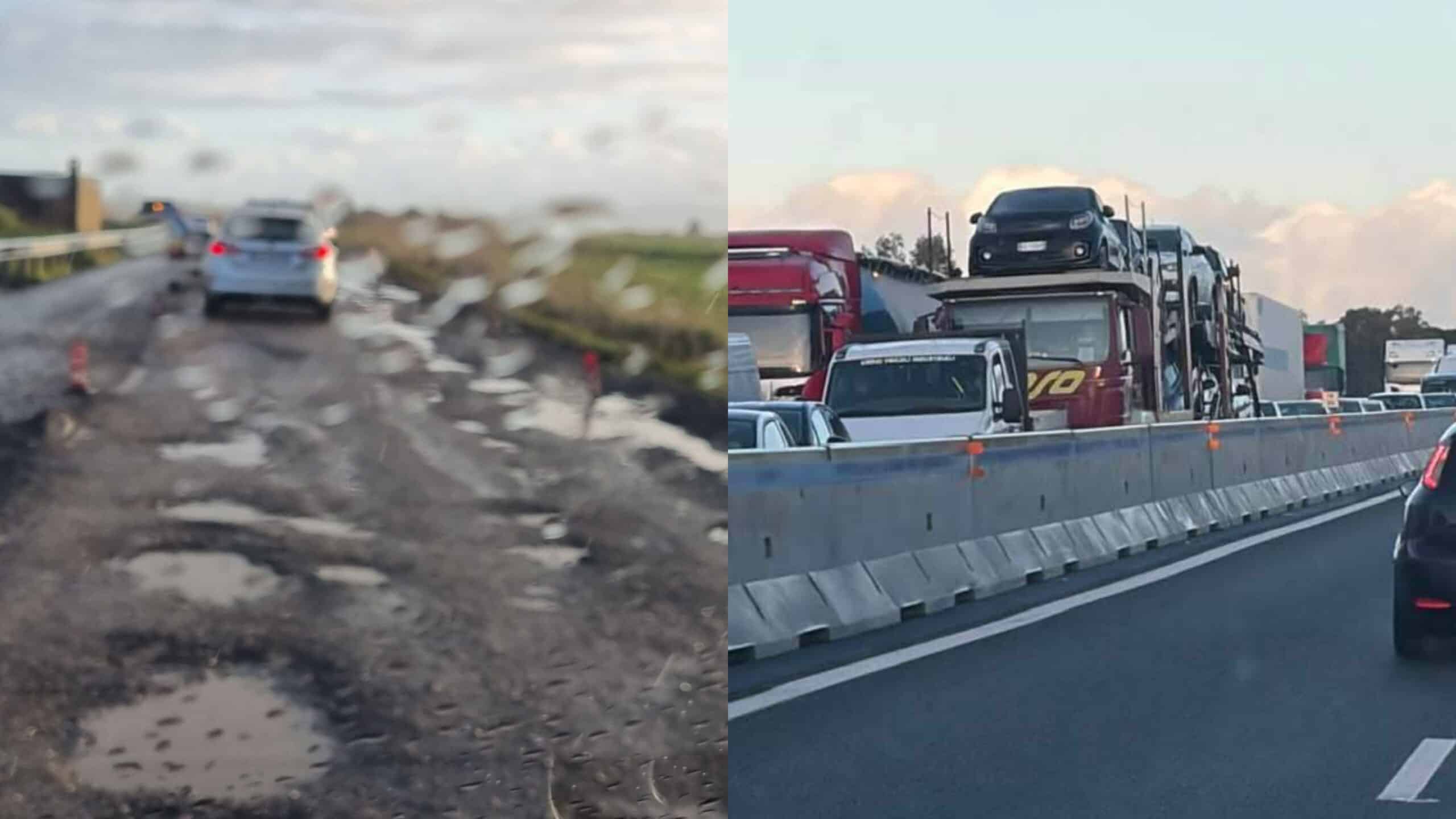C’è chi lo definisce “il viaggio della speranza” quello che si snoda in “una sola corsia che sembra una strada di campagna”: complice la pioggia, l’asfalto ha ceduto, si è sgretolato impedendo il fluido passaggio del traffico. Ore di marcia per percorrere pochi chilometri e la fila di mezzi pesanti e veicoli diventa quasi infinita.