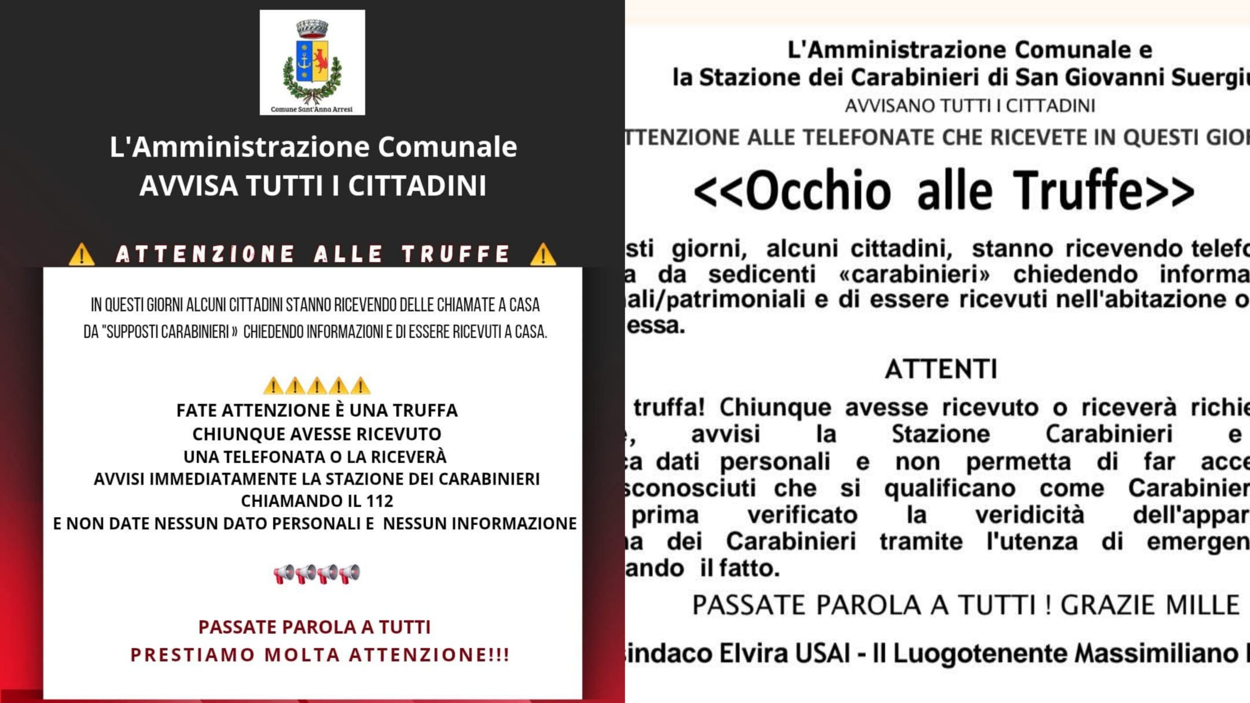 Per telefono o di persona, ogni scusa è buona: dagli investimenti all’estero con la promessa della moltiplicazione dei soldi, eclatante è il caso di un pensionato di Samassi che ha già perso oltre 50 mila euro, ai finti carabinieri che chiedono dati o un appuntamento. “In questi giorni alcuni cittadini stanno ricevendo delle chiamate a casa da “supposti carabinieri” chiedono informazioni e di essere ricevuti a casa. Fate attenzione, è una truffa. Chiunque avesse ricevuto una telefonata o la riceverà avvisate immediatamente la stazione dei carabinieri” spiega l’amministrazione comunale di Sant’Anna Arresi. Stesso inganno a San Giovanni Suergiu: “Si invita tutta la cittadinanza a prestare la massima attenzione e a vigilare in particolare sulle persone anziane, in merito a tentativi di truffa segnalati anche nel nostro territorio” comunica il Comune.