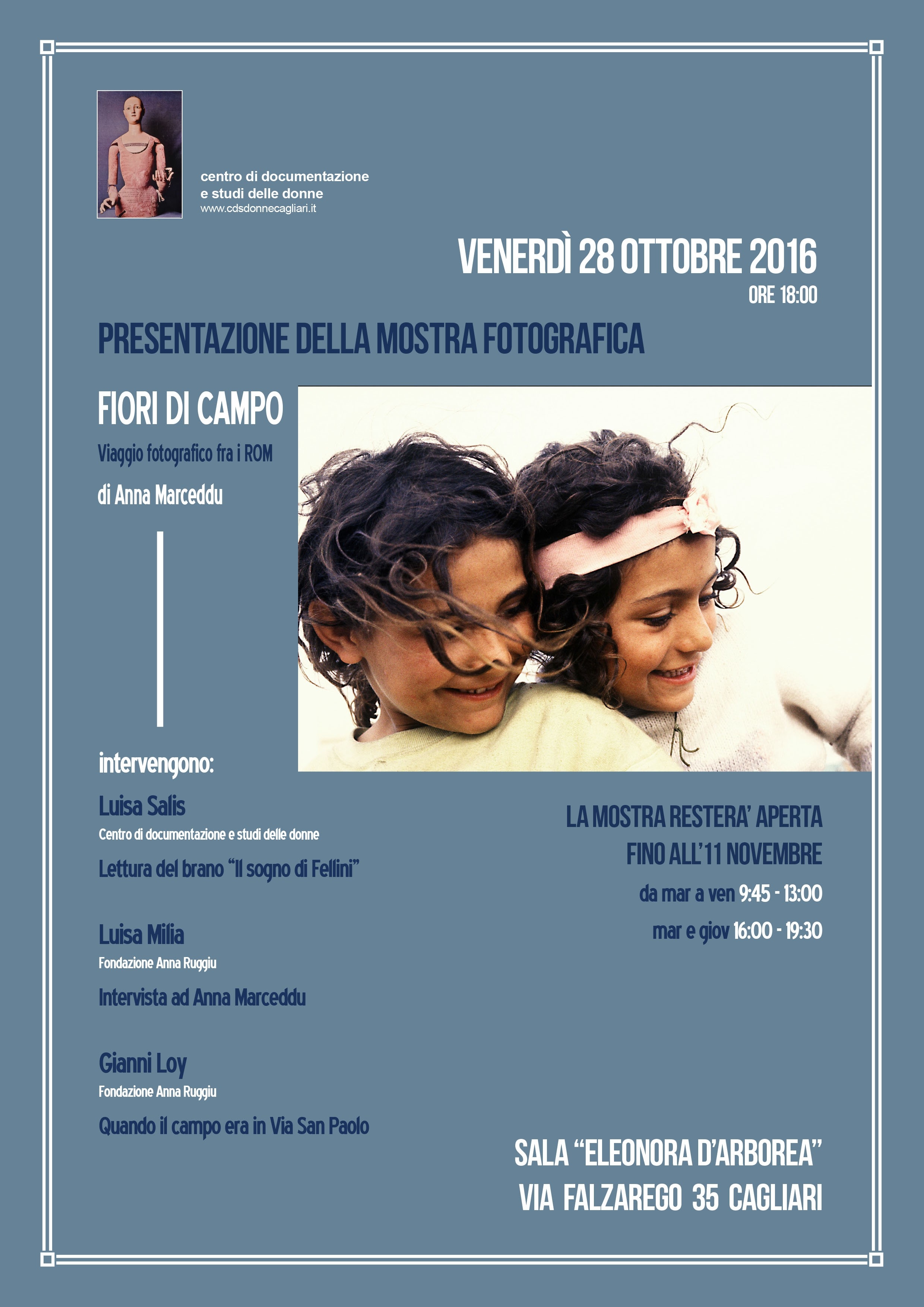 Venerdì 28 ottobre, alle 18.00, nella Sala Eleonora d’Arborea in via Falzarego 35 a Cagliari, il Centro di Documentazione e Studi delle donne inaugura la mostra fotografica FIORI DI CAMPO Viaggio fotografico fra i ROM di Anna Marceddu.