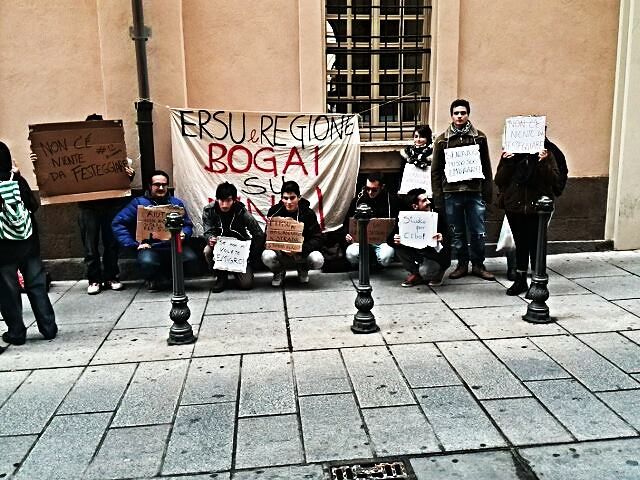 “C’è ben poco da festeggiare quest’anno. E’ vergognoso che ancora molti giovani sardi vedano cadere ogni prospettiva di successo formativo universitario perché non sono stanziati abbastanza fondi per coprire la richiesta di borse ed alloggi”, dichiara Manuel Gennari, reggendo un cartello con su scritto “Aiutatemi, sono senza borsa di studio”.