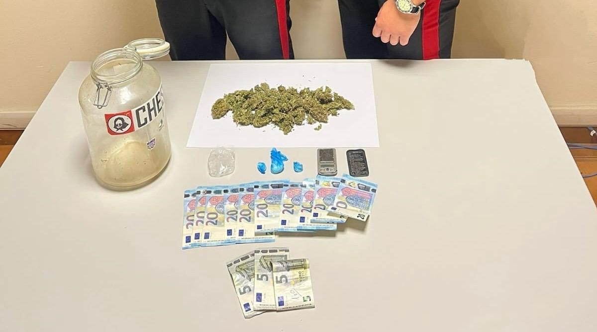 Il soggetto è stato fermato in via San Martino durante un controllo di polizia. La perquisizione personale e del veicolo ha portato al rinvenimento di tre dosi di cocaina, per un peso complessivo di 4 grammi. La successiva perquisizione domiciliare ha permesso di sequestrare 33,43 grammi di marijuana, un bilancino di precisione, materiale per il confezionamento delle dosi e 215 euro in contanti, ritenuti provento dell’attività di spaccio.
