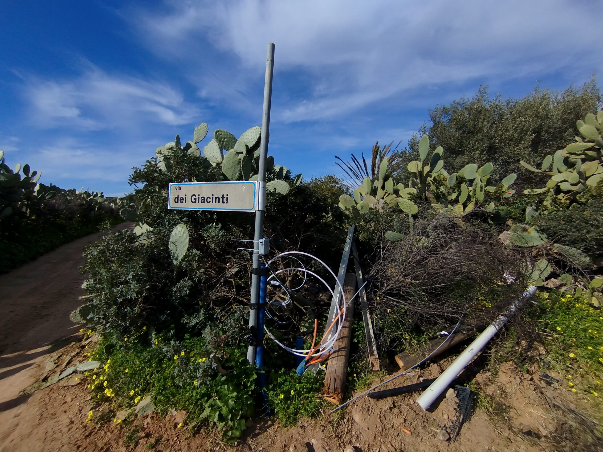 “L’ultima tempesta di maestrale di più di dieci giorni fa ha causato l’abbattimento di tre pali della linea telefonica che serve la zona, ubicati nella via degli Hibiscus a partire dall’agriturismo S.Martino” spiega Marco R.