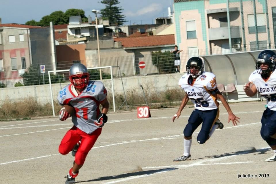 Pagina voltata subito e con l’utilizzo di un inchiostro straripante. I Cru fanno tabula rasa di quel massacro perpetrato dagli orsi capitolini la scorsa settimana e scrivono il tema della riscossa dettando legge sui giovani della Legio XIII che solo alla distanza hanno ceduto malamente. Infatti per un quarto e mezzo il piacevole sole pomeridiano induceva i più a sonnecchiare sugli spalti perché erano le difese a dire la loro opponendosi con ostinazione a qualsiasi sortita offensiva. Una lunga sgroppata di Riccardo Pili riesce nell’intento di squarciare quell’amaca virtuale che dondolava sulle teste dei presenti, ma prima di arrivare alla svolta devono passare ancora diversi minuti. Terramaini si desta grazie alla progressione di Pierpaolo Mudu che raccoglie l’invito del qb matteo Todde per involarsi sul lato destro e sbloccare il risultato. Alberto Cannas si ritrova nelle sembianze di un rapinatore quando con estrema facilità riesce a sfilare l’ovale all’avversario e andare nuovamente verso la linea di meta. I romani sono disorientati, forse anche a causa dell’infortunio di Emanuele Faroni, pedina importante che inutilmente ha supplicato il medico di campo per fare rientro sul terreno di gioco: ma la lesione era davvero seria. Intanto i padroni di casa chiudono la prima frazione con due punti addizionali siglati ancora da Riccardo Pili in versione runningback. Visibilmente ringalluzziti i ragazzi locali vengono esortati a premere ancora da parte del coaching staff che a bordo campo elargisce consigli preziosi. Pili si ripete anche nell’altra metà campo e Cannas finalizza alla sua maniera prima di realizzare altre due mete che. Anche i laziali riescono finalmente a mettere un piccolo sigillo in una giornata di assoluta matrice rosso argento. Tra le due segnature di Cannas è Mudu ad offrire il suo bis pomeridiano.