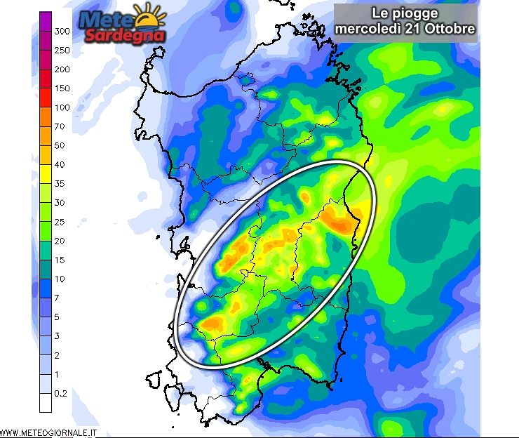 Le piogge di oggi, mercoledì 21 Ottobre, secondo il nostro modello LAM ad alta risoluzione.
