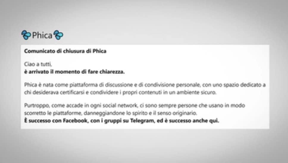 Sono gli amministratori a comunicare la decisione: “Phica è nata come piattaforma di discussione e di condivisione personale, con uno spazio dedicato a chi desiderava certificarsi e condividere i propri contenuti in un ambiente sicuro. Purtroppo, come accade in ogni social network, ci sono sempre persone che usano in modo scorretto le piattaforme, danneggiandone lo spirito e il senso originario. È successo con Facebook, con i gruppi su Telegram, ed è successo anche qui”.
