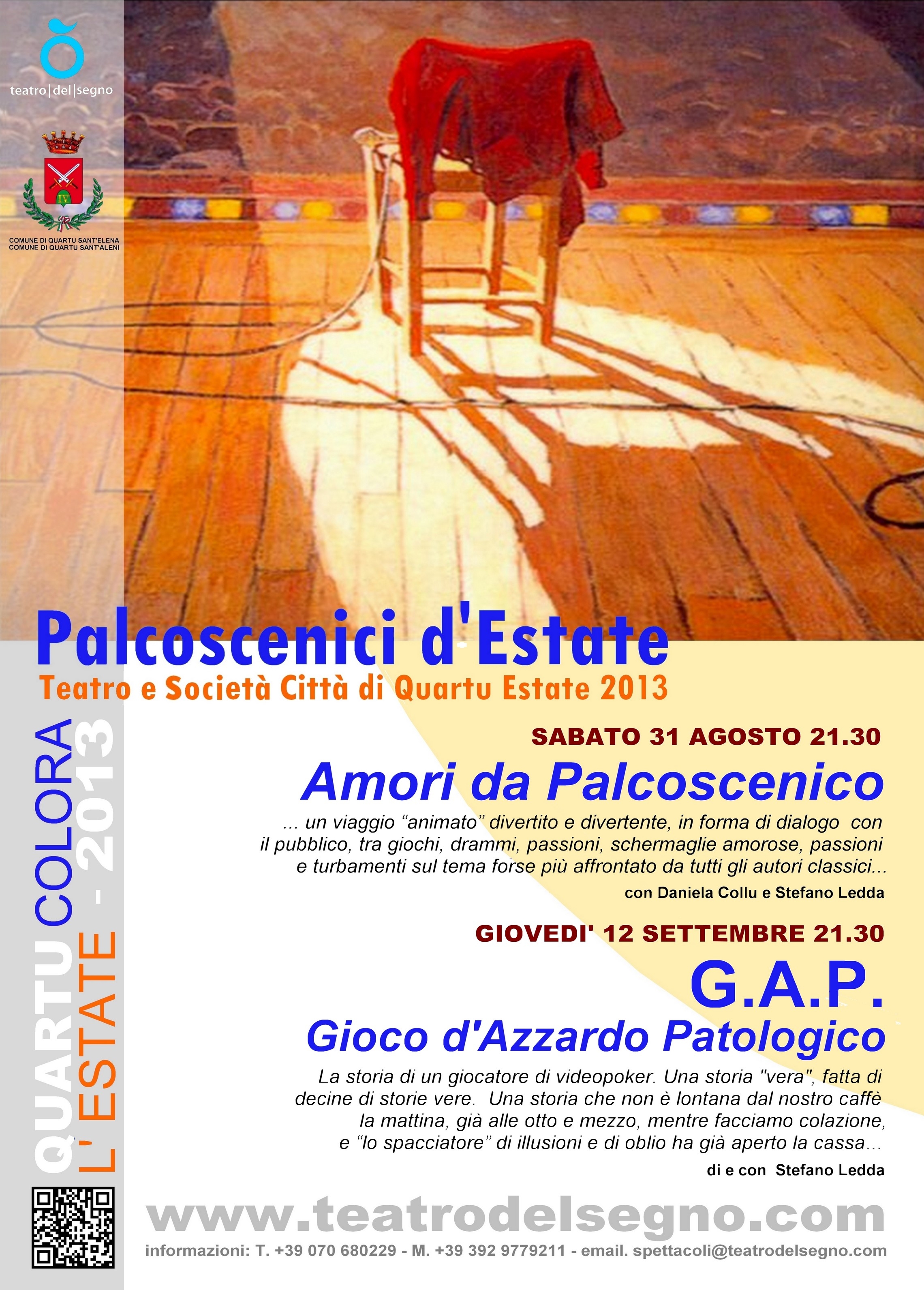 “GAP – Gioco d’Azzardo Patologico” – che giovedì 12 settembre chiude la mini-rassegna Palcoscenici d’Estate firmata Teatro del Segno e incastonata nel ricco programma di Quartu Colora l’Estate 2013 (a cura dell’amministrazione comunale) – rappresenta un viaggio nei labirinti della mente e del cuore umano, attraverso il racconto del protagonista, quasi un diario di una passione fatale capace di vincere l’amore per la sposa e superare la sfera degli affetti, in una distorsione della realtà e dei valori, ma pure del senso stesso dell’esistenza. Una storia particolare in cui s’intrecciano verità e invenzione, o meglio la somma e la sintesi di tante vicende simili eppure diverse, dagli esiti (im)prevedibili, ma quasi inevitabilmente amari: una storia di perdizione e (forse) redenzione, un cammino difficile e arduo per riconquistare dignità e equilibrio, e ritrovare se stessi.